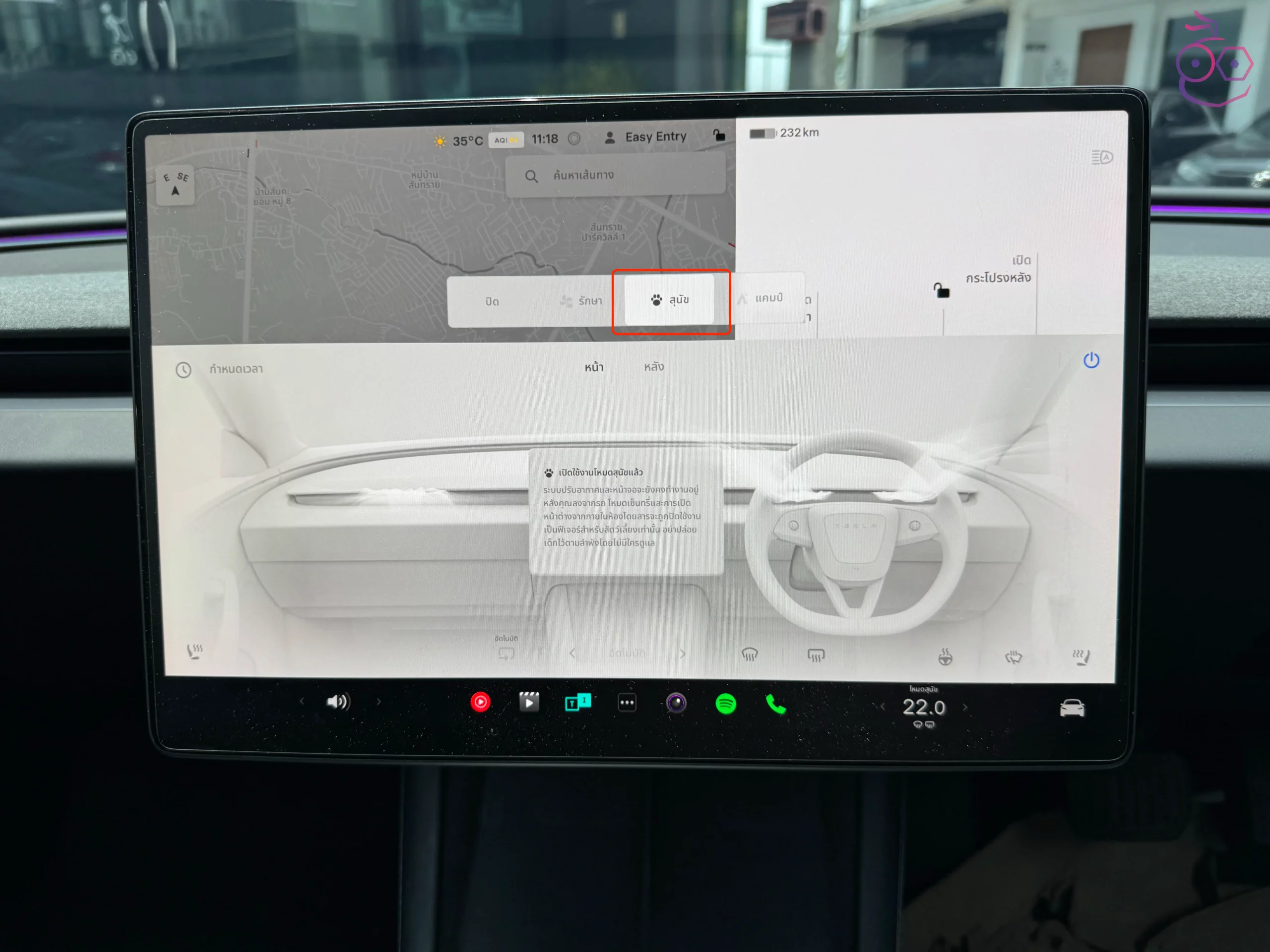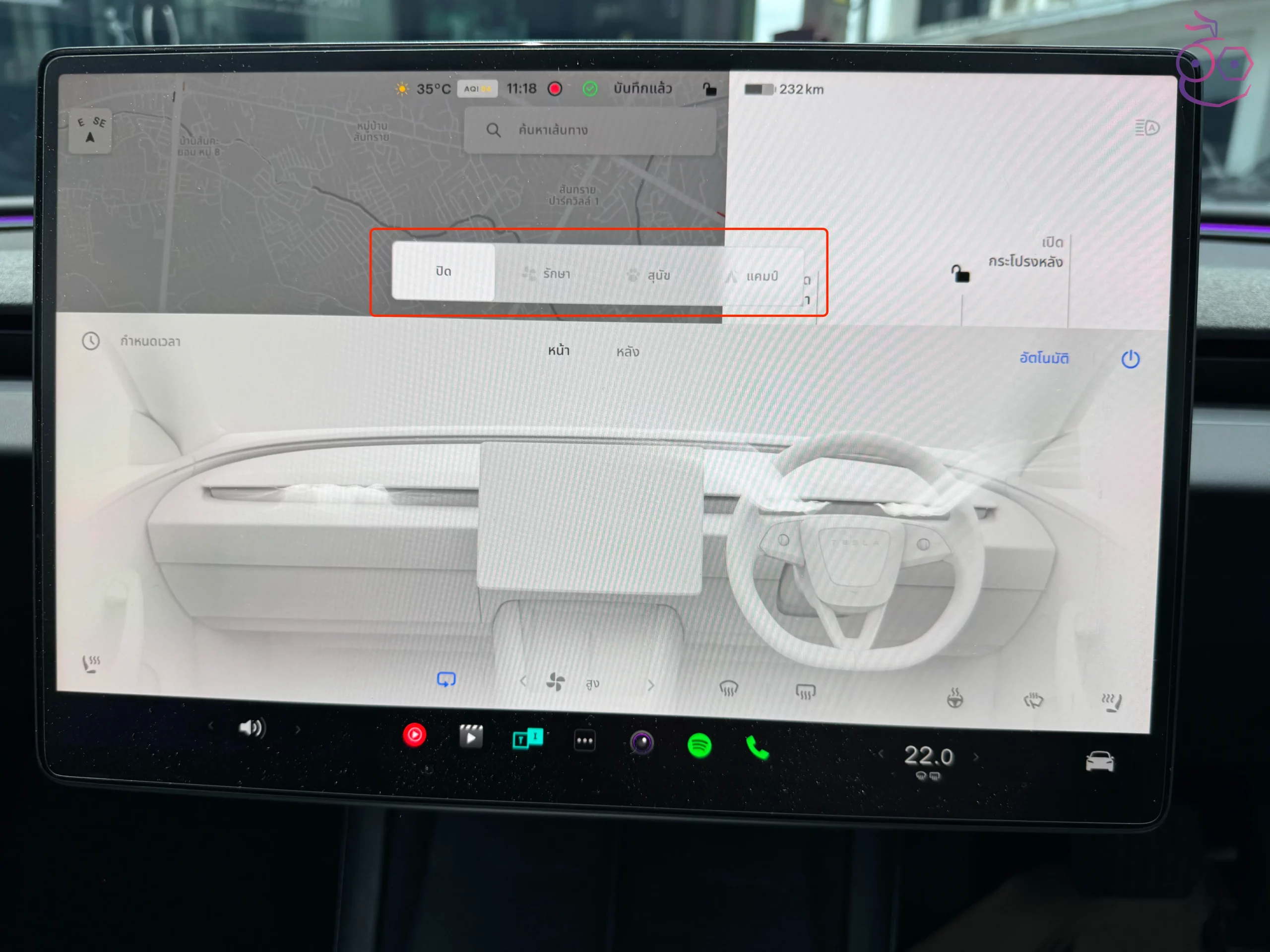 หากต้องการเปิดหรือปิดการตั้งค่าเหล่านี้ ให้ปัดขึ้นจากสัญลักษณ์อุณหภูมิบนหน้าจอแสดงผลในรถขณะที่จอดรถอยู่ จากนั้นแตะที่ โหมดสุนัข (Dog Mode), โหมดแคมป์ (Camp Mode) หรือ รักษาสภาพอากาศ (Keep Climate)