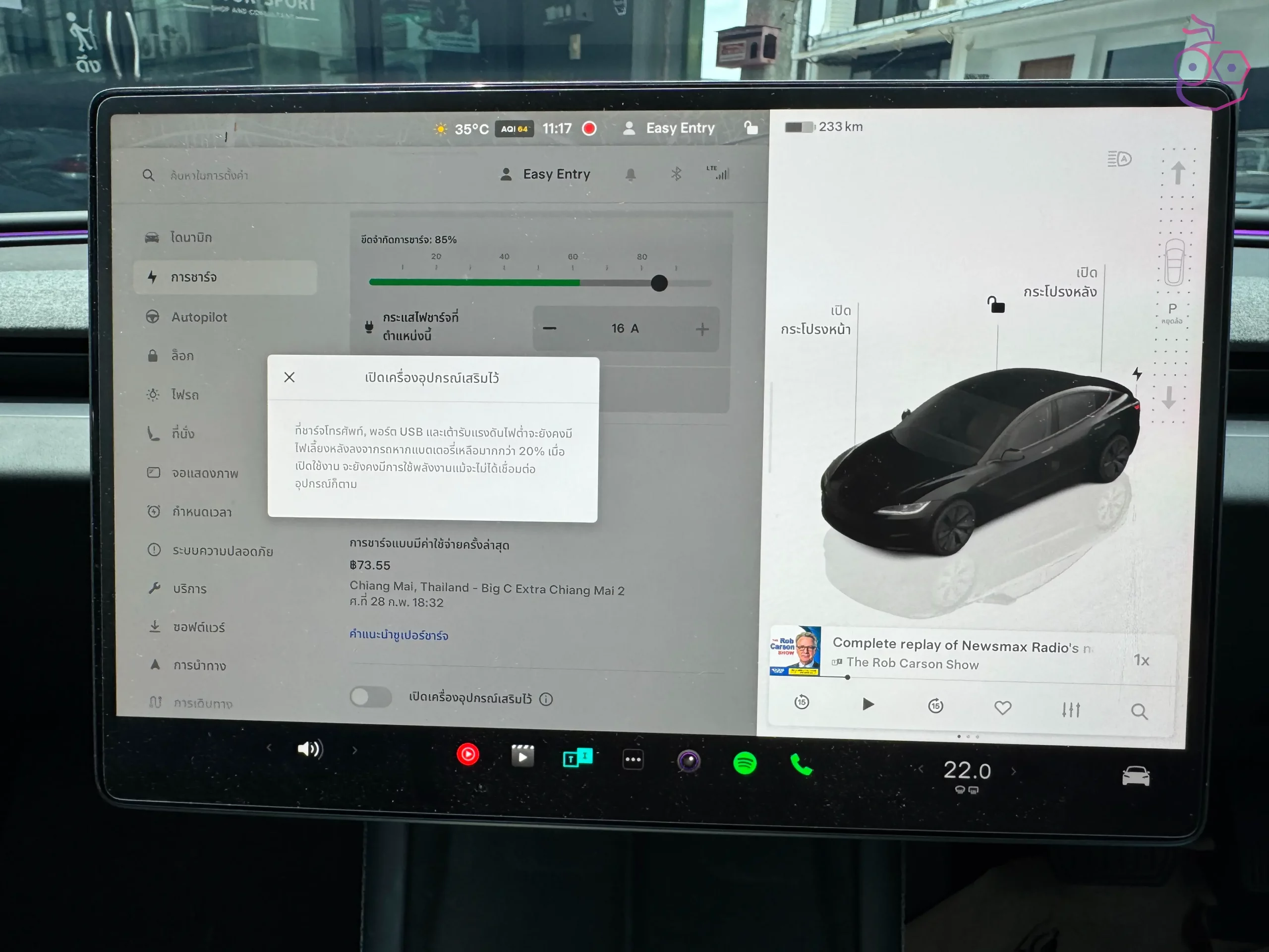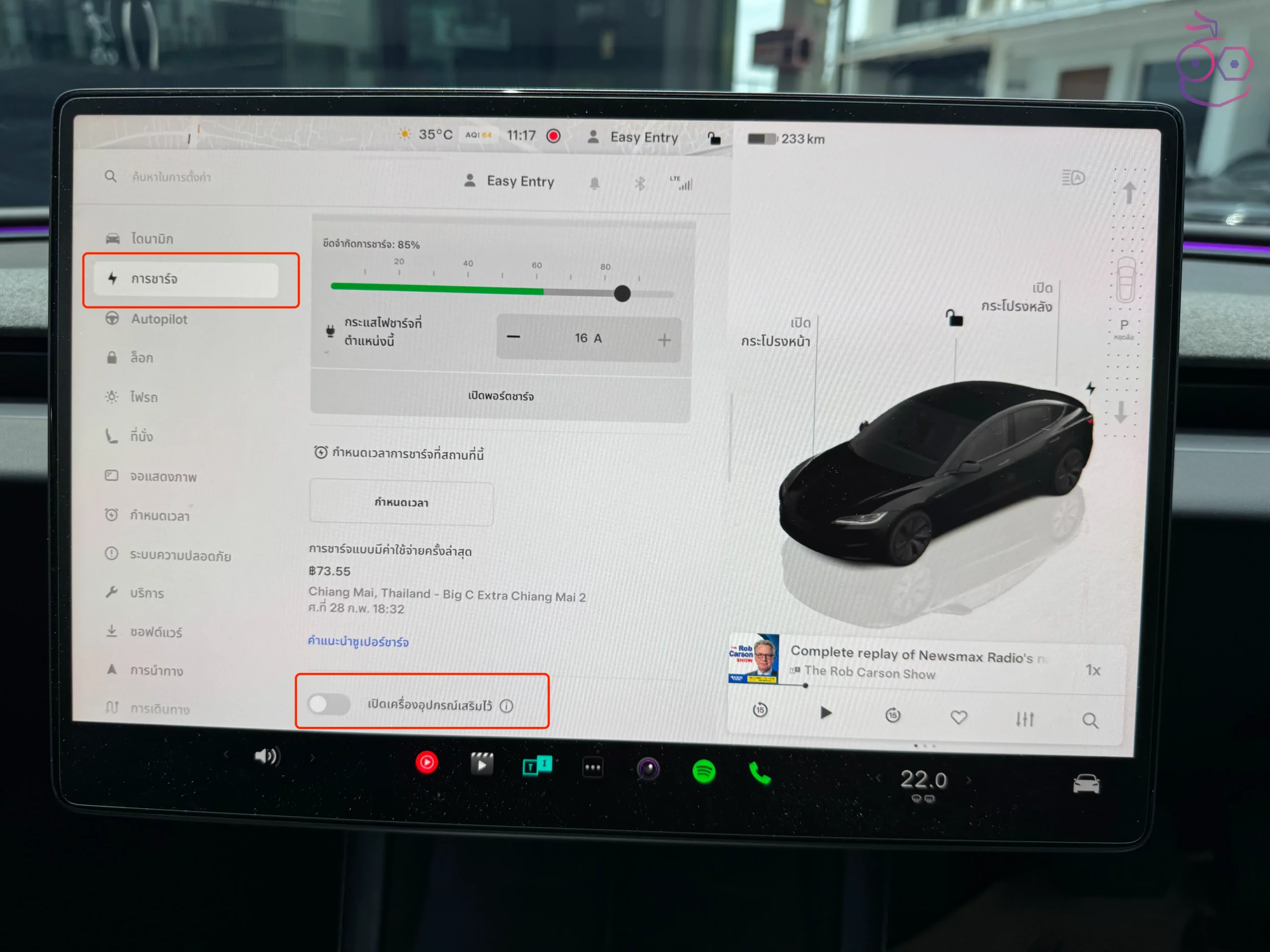 ผู้ใช้สามารถเปิดฟีเจอร์นี้ได้ โดยไปที่ ควบคุม (Controls) > การชาร์จ (Charging) > เปิดเครื่องอุปกรณ์เสริมไว้ (Keep Accessory Power On)