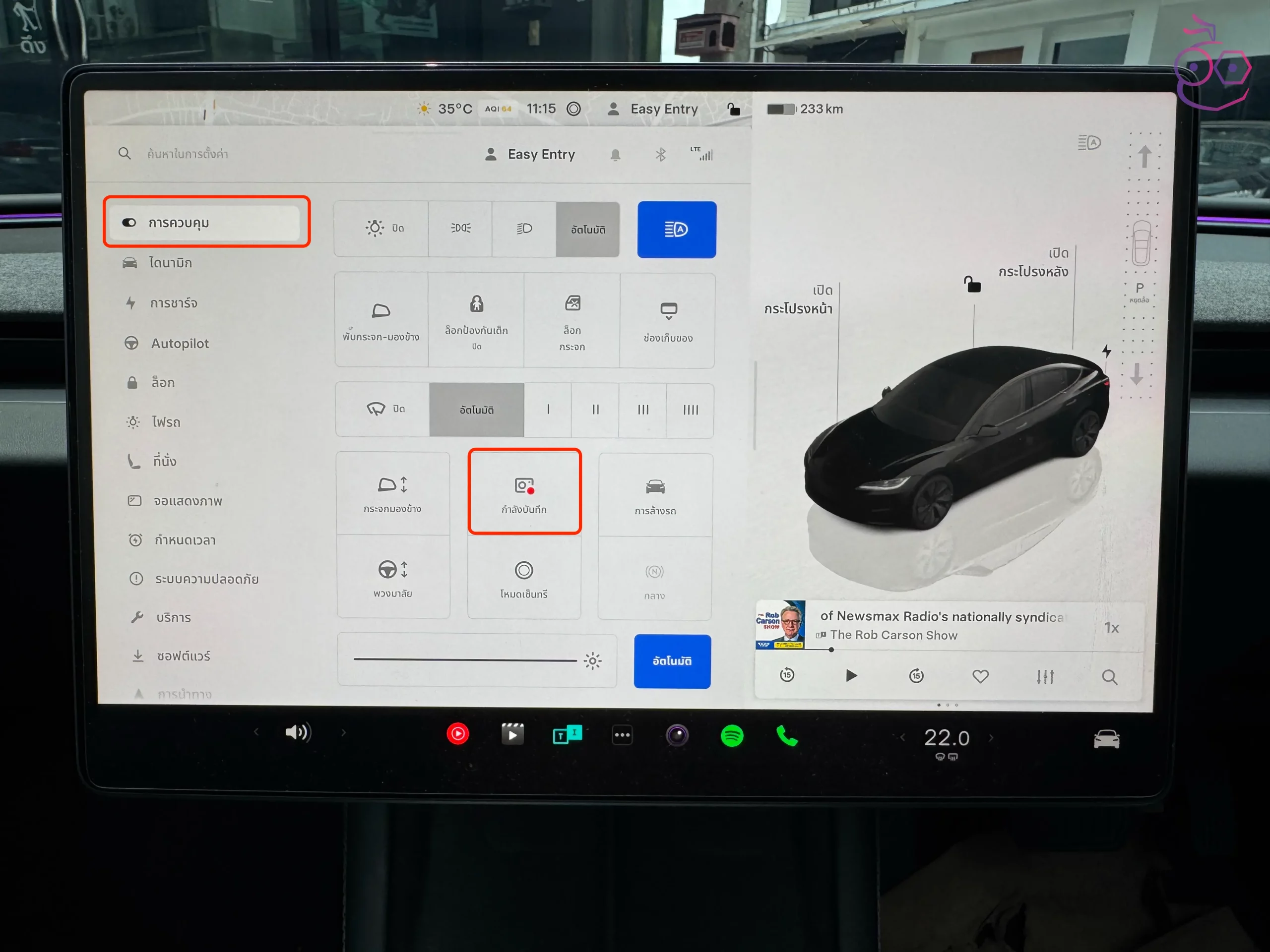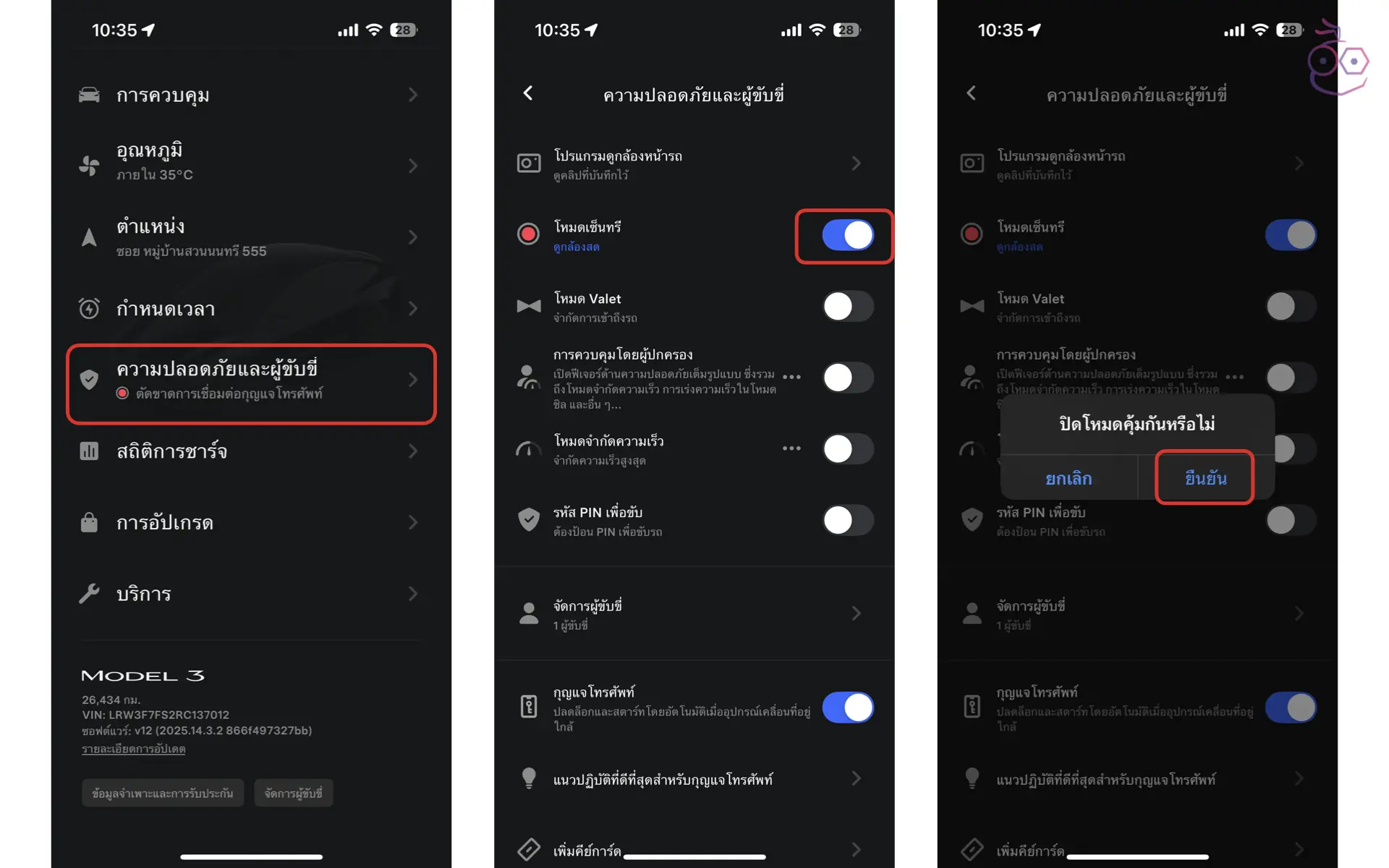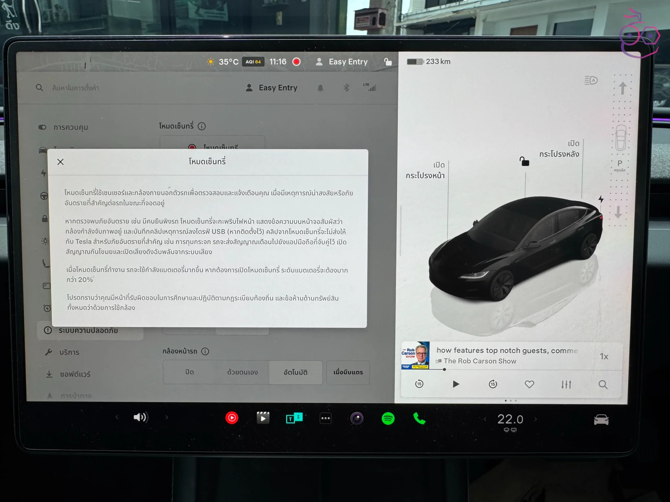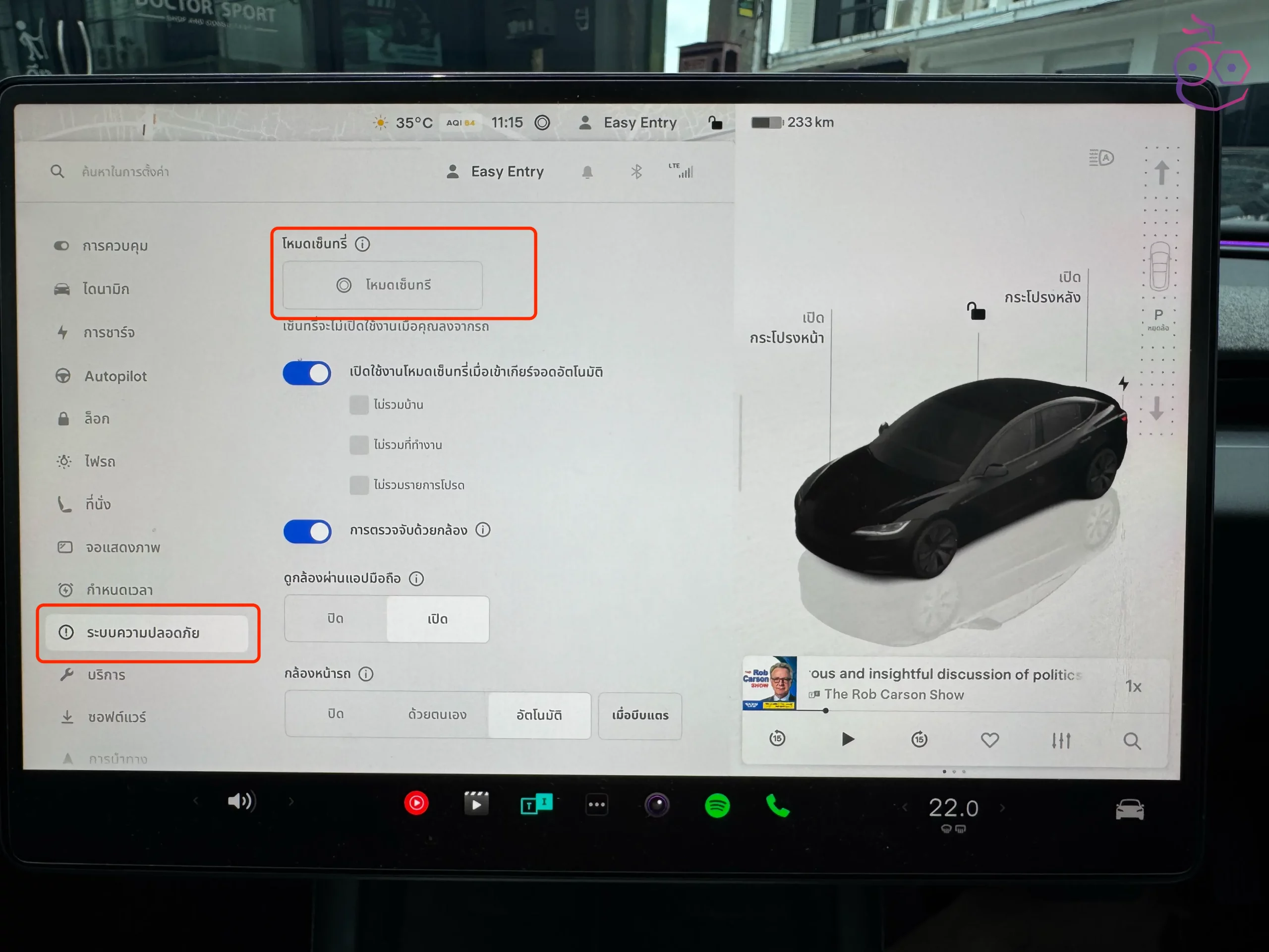 สามารถเปิดหรือปิดโหมด Sentry ได้ที่ ควบคุม (Controls) > ความปลอดภัย (Safety) > โหมด Sentry (Sentry Mode)