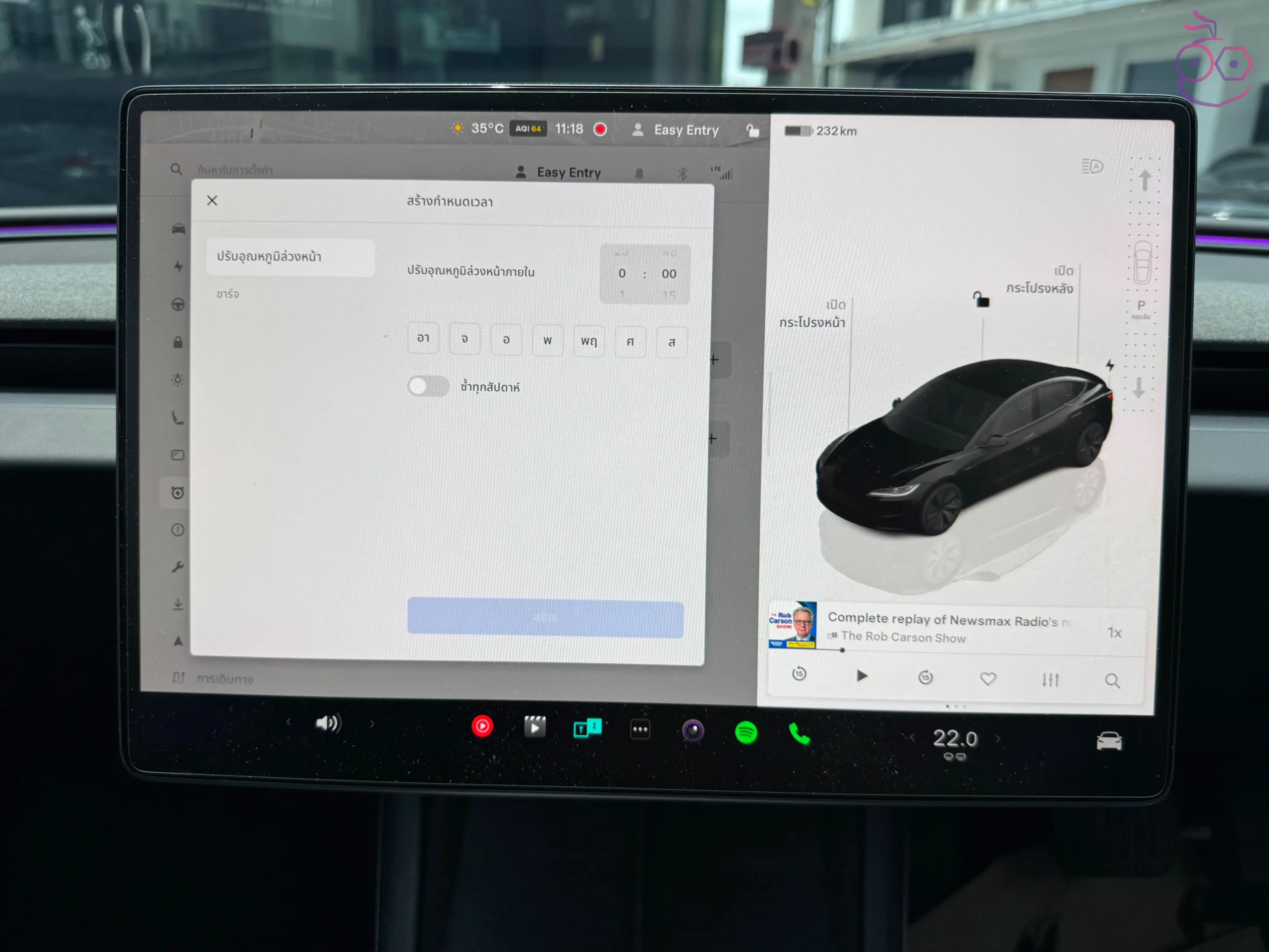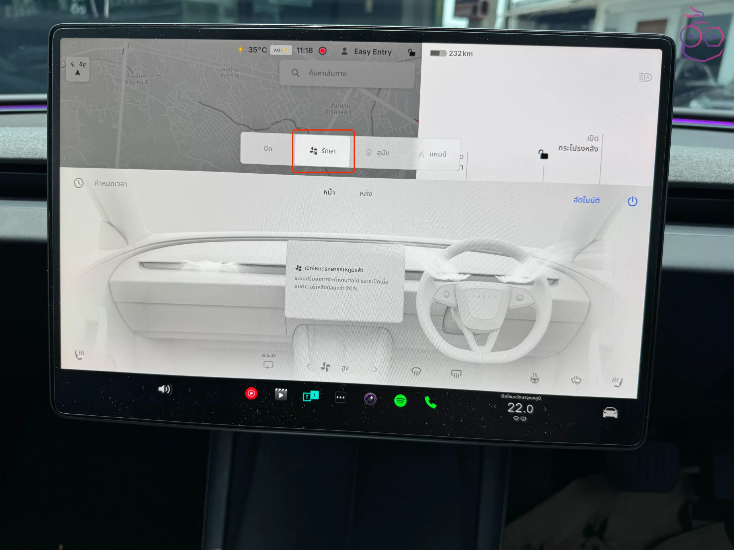 นอกจากนี้ ผู้ใช้ยังสามารถเปิดหรือปิดระบบป้องกันห้องโดยสารร้อนจัด รวมถึงปรับอุณหภูมิการทำงานได้จากแอป Tesla โดยเลือก อุณหภูมิ (Climate) แล้วปัดขึ้น จากนั้นก็ตั้งค่าการป้งอกันความร้อนเกินในห้องโดยสารได้เลย