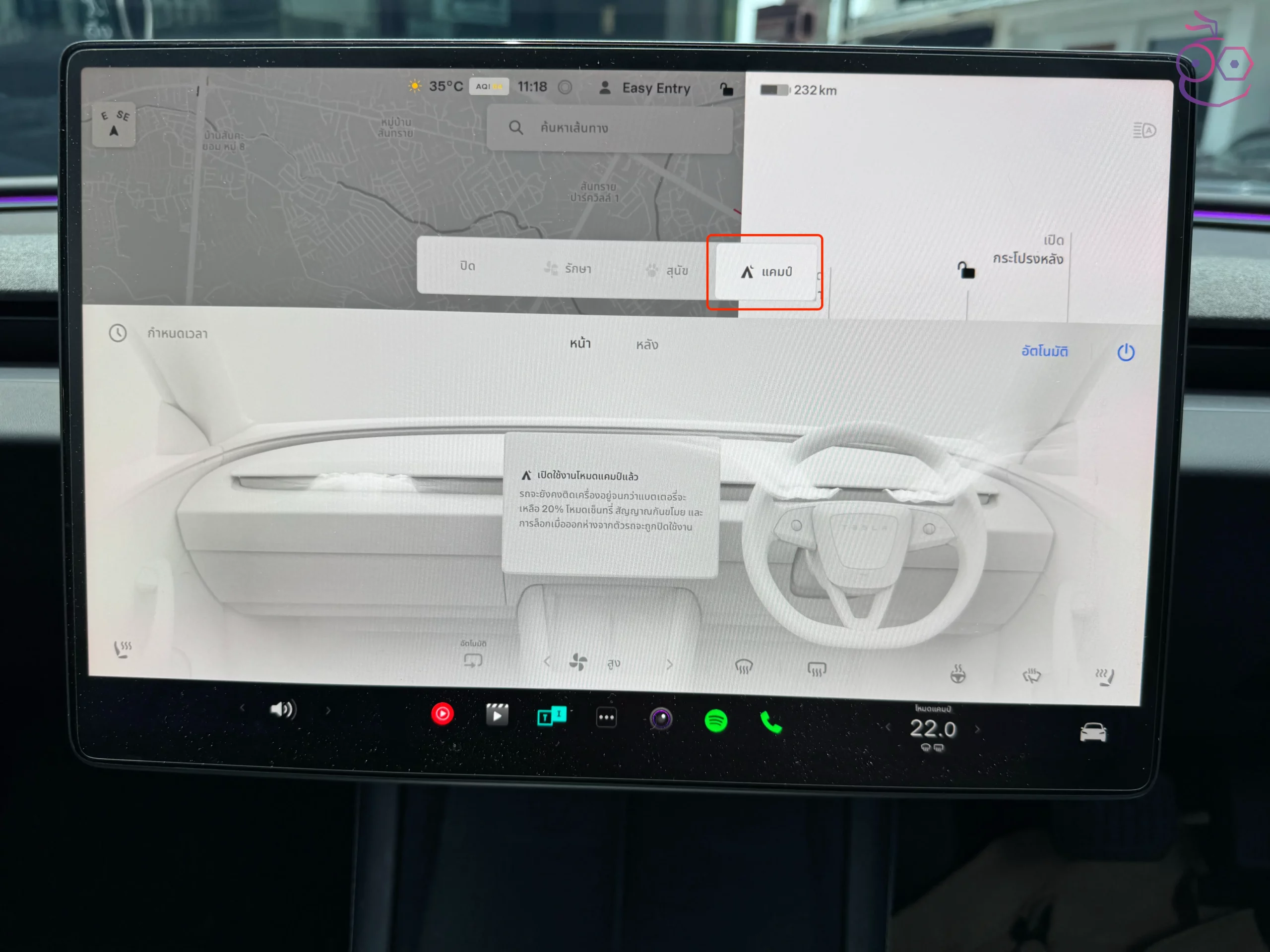 เมื่อเปิดโหมดแคมป์ รถจะสามารถจ่ายไฟให้อุปกรณ์อิเล็กทรอนิกส์ผ่านพอร์ต USB ในขณะที่ยังคงรักษาระดับอุณหภูมิห้องโดยสาร หน้าจอสัมผัสจะยังคงเปิดอยู่ ทำให้ผู้ใช้ใช้ชีวิตอยู่ในรถได้ สามารถฟังเพลง เล่นเกม หรือดูภาพยนตร์ได้