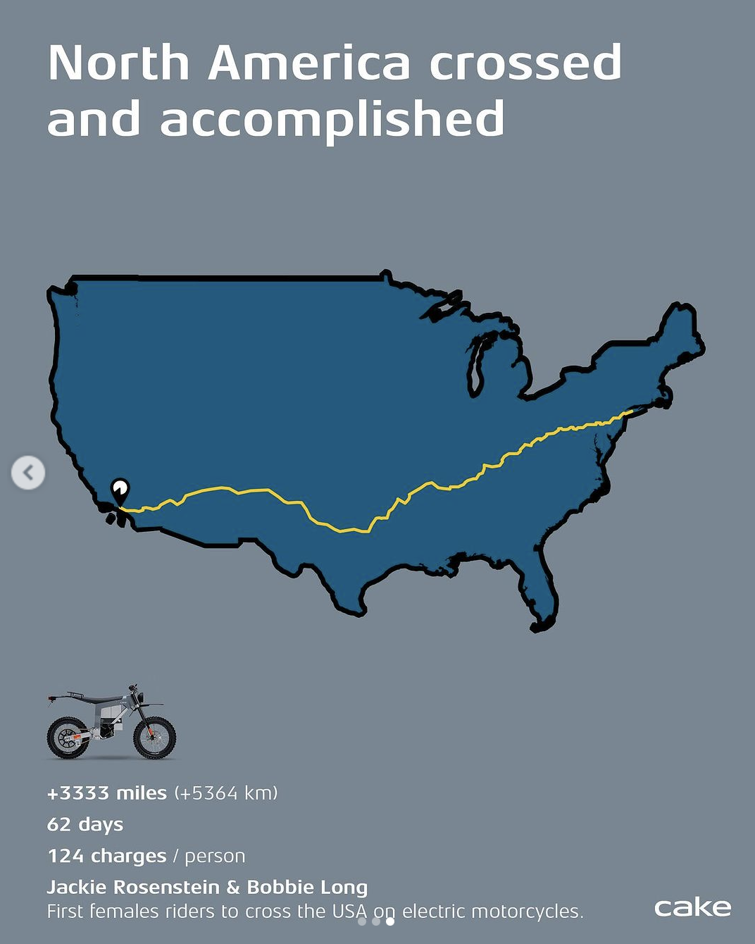 Jackie Rosenstein และ Bobbie Long began ได้ทำการเดินทางครั้งนี้เป็นระยะทางทั้งสิ้น 5,363 กิโลเมตร โดยใช้มอเตอร์ไซต์ไฟฟ้า CAKE เริ่มจากเมือง New York ในเดือนตุลาคม 2023 ใช้เวลาทั้งสิ้น 62 วันจนกระทั่งไปถึงที่ Marina Del Ray รัฐ California โดยทำการชาร์จไฟฟ้าไปทั้งหมด 124 ครั้ง 62 วัน