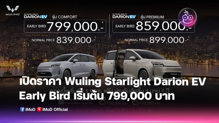 สำหรับลูกค้าที่กำลังพิจารณารถยนต์ไฟฟ้าแบบ MPV-VAN ประตูสไลด์ไฟฟ้า หรือ Family Car นี่คือช่วงเวลาที่ดีที่สุดในการตัดสินใจ WULING THAILAND มอบแคมเปญสุดเอ็กซ์คลูซีฟฉลองการเปิดตัวบริษัทอย่างเป็นทางการ พร้อมประกาศราคาช็อกตลาดสำหรับ WULING STARLIGHT DARION EV เริ่มต้น 799,000 บาท