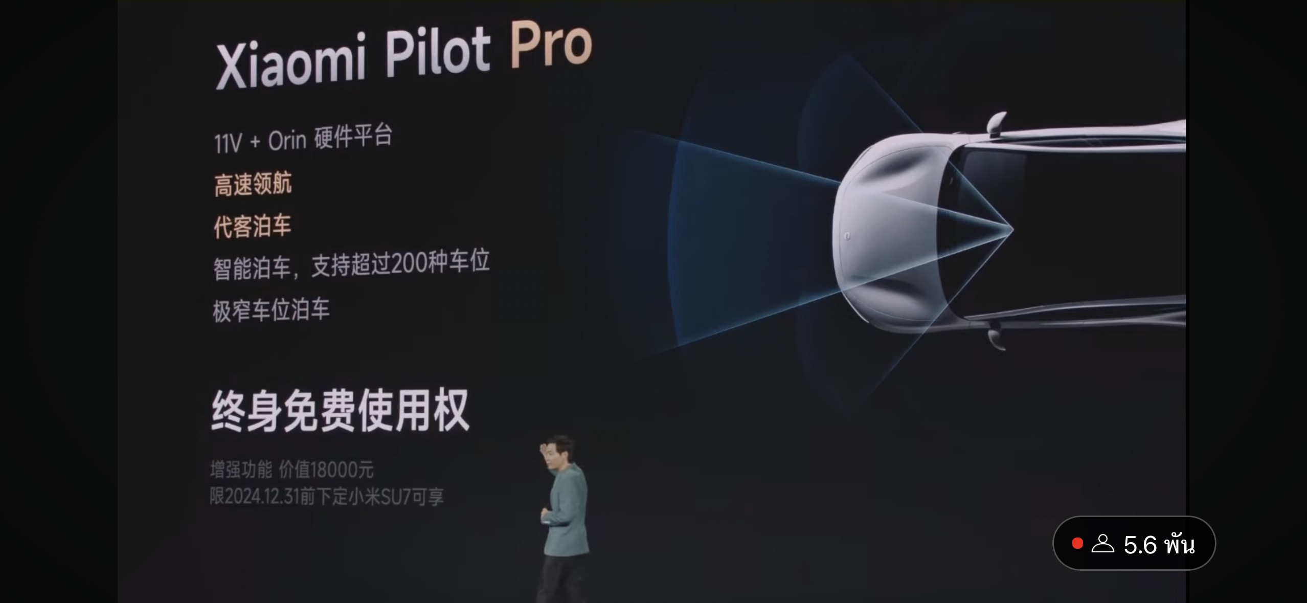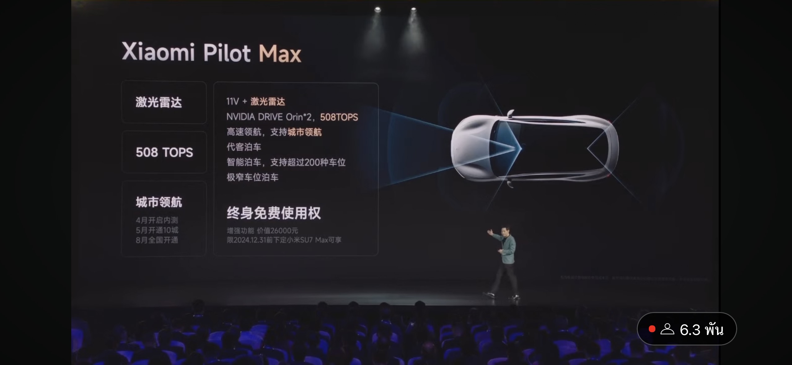 Xiaomi รุ่นSU7 จะได้รับระบบ Xiaomi Pilot Pro และในรุ่น SU7 Pro ส่วนรุ่น SU7 Max จะได้รับระบบ Xiaomi Pilot Max และเซ็นเซอร์ LiDAR พลังประมวลผล 508 TOPS