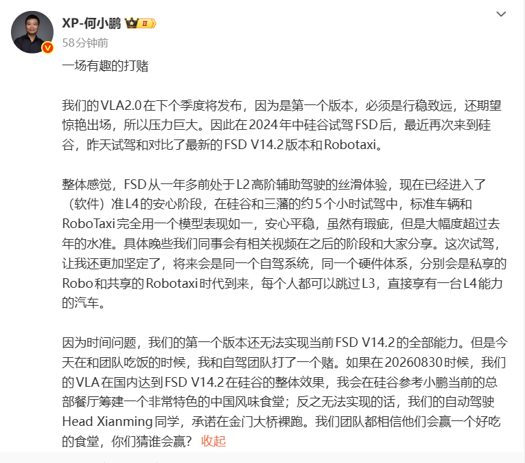 นอกจากนี้ เขายังเพิ่มสีสันติดตลกให้กับเป้าหมายนี้ด้วยการท้าทายทีมงานพัฒนาระบบขับขี่อัตโนมัติของ Xpeng ต่อหน้าสาธารณะว่า หากทำได้ตามเป้าหมายภายในปี 2026 เขาจะอนุมัติให้สร้างโรงอาหารสไตล์จีนสำหรับทีมงาน Xpeng ใน Silicon Valley แต่ถ้าทำไม่สำเร็จ Liu Xianming หัวหน้าหน่วยระบบขับขี่อัตโนมัติของ Xpeng ได้สาบานไว้ว่า จะออกไปวิ่งแก้ผ้าบนสะพาน Golden Gate