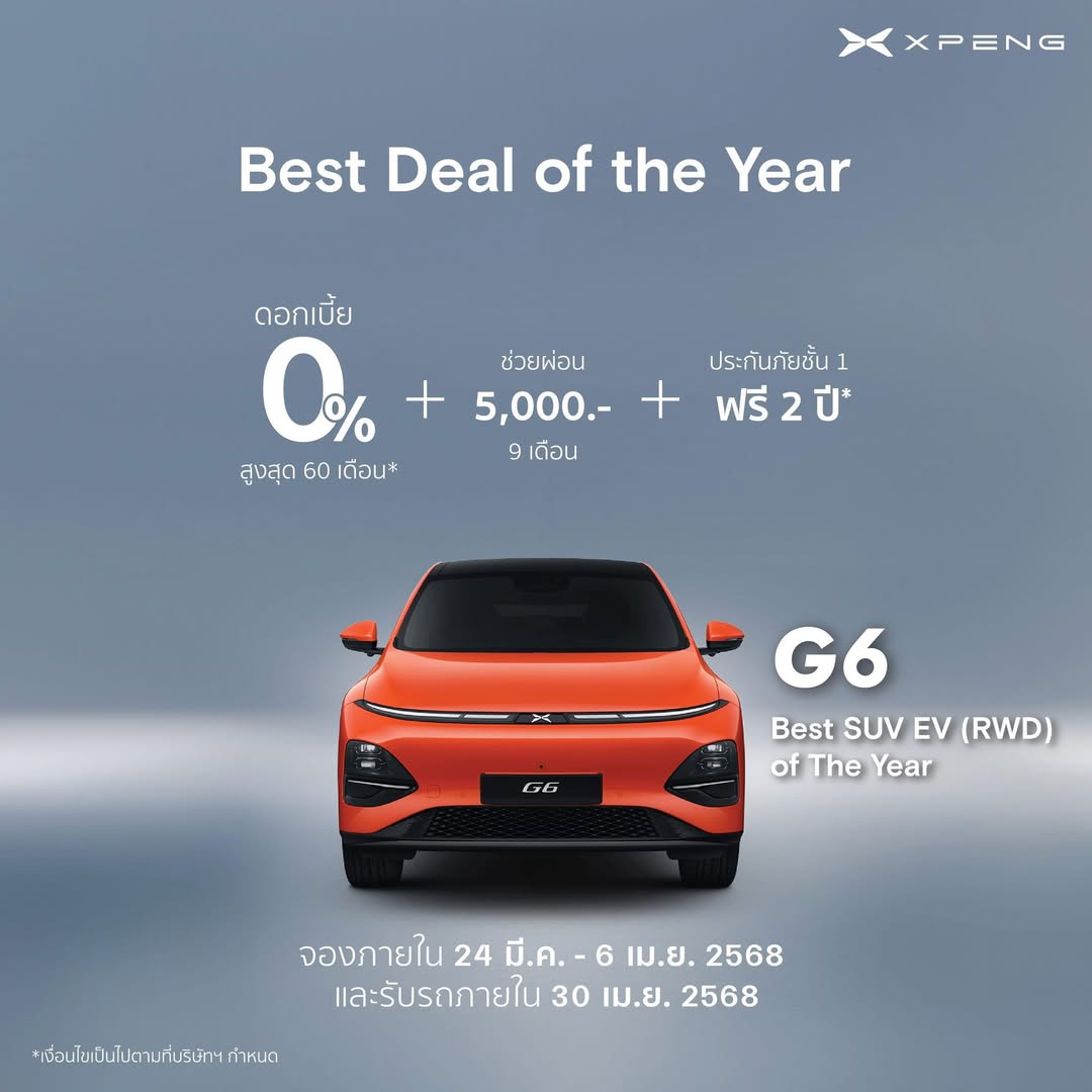 หลังจาก XPENG G6 ได้รับรางวัล ‘Best SUV EV (RWD)’ ในงาน THAILAND CAR OF THE YEAR 2025 แบรนด์ได้ออกข้อเสนอแรงสุดแห่งปีอย่าง Best Deal of the Year ข้อเสนอสำหรับ G6 โดยเฉพาะสามารถดีลข้อเสนอทั้งในงาน Motor Show 2025 และโชว์รูม XPENG ทุกสาขา