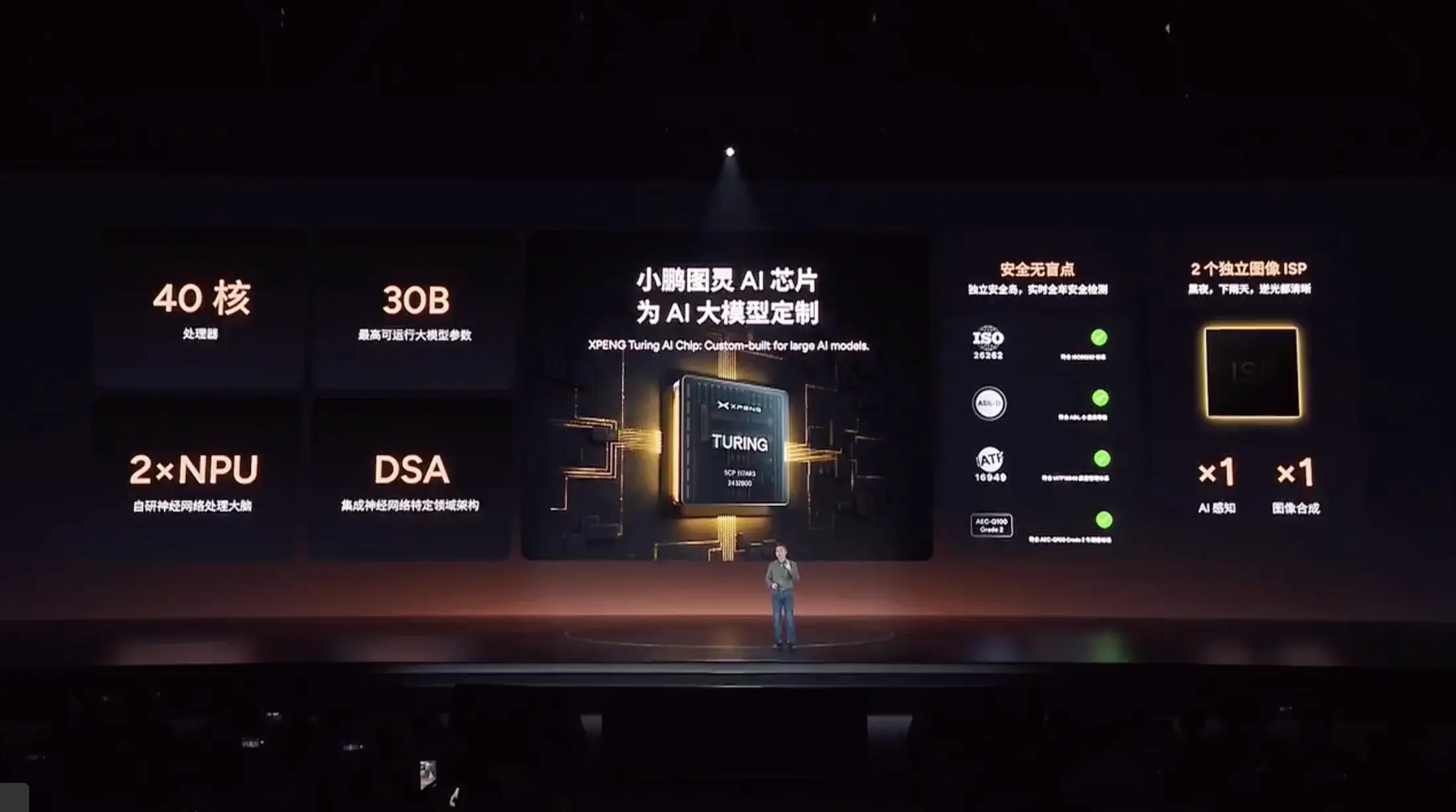 รายงานระบุว่า ชิป Turing ของ Xpeng ได้รวมหน่วยประมวลผลเครือข่ายประสาท 2 หน่วย ที่ออกแบบมาเฉพาะสำหรับงานด้าน AI ซึ่งพัฒนาโดยทีมของ Xpeng เอง ชิปตัวนี้สามารถประมวลผลโมเดลขนาดใหญ่ได้ถึง 30,000 ล้านพารามิเตอร์ และมีประสิทธิภาพสูงกว่าชิปรถยนต์ทั่วไปถึง 20%